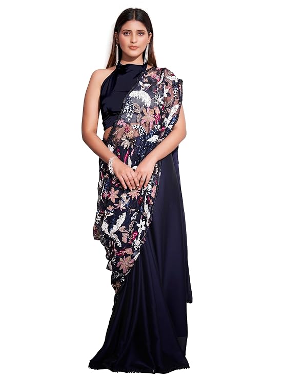 - Blue colored designer saree with heavy embroidery on shoulder portion